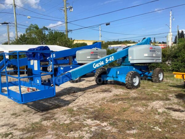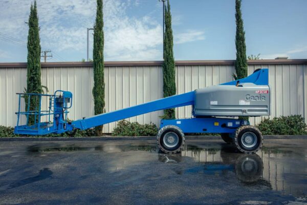 The Genie S40 boom lift features a lift height of 40 feet, enabling you to reach any location you require. Its foam-filled tires, robust Deutz diesel engine, and four-wheel drive capabilities allow it to tackle various terrains while maintaining that height. As a result, this machine provides a level of versatility for tasks that other lifts cannot match.
