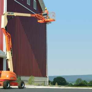 The JLG 450AJ articulating boom lift, with a reach of 45 feet, is ideal for navigating over obstacles and extending upward. Its articulated boom provides enhanced maneuverability compared to a straight boom, offering more flexibility in positioning. The 450AJ features a 4-foot-1-inch jib, which allows for better control and assists in accessing challenging locations. Articulating boom lifts are perfect for a variety of applications, including construction, maintenance, tree trimming, and more.