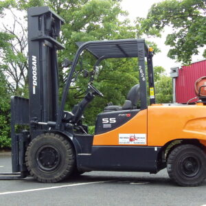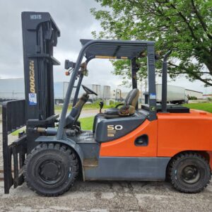 The Doosan G50C-7 is a forklift recognized for its durability and exceptional performance in challenging industrial settings. It is powered by a robust engine that delivers outstanding lifting capabilities. The design prioritizes operator comfort and safety, featuring ergonomic controls and a roomy cabin. With advanced hydraulic systems, it offers smooth and precise handling. Furthermore, the forklift includes sturdy components and a resilient chassis, which contribute to its longevity and dependability in heavy-duty tasks.
